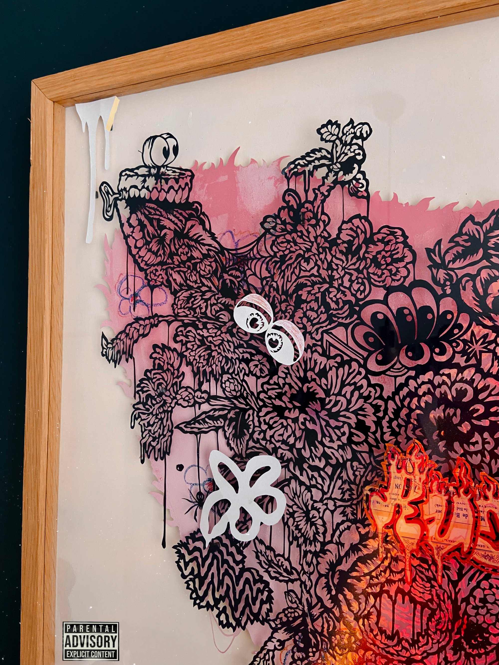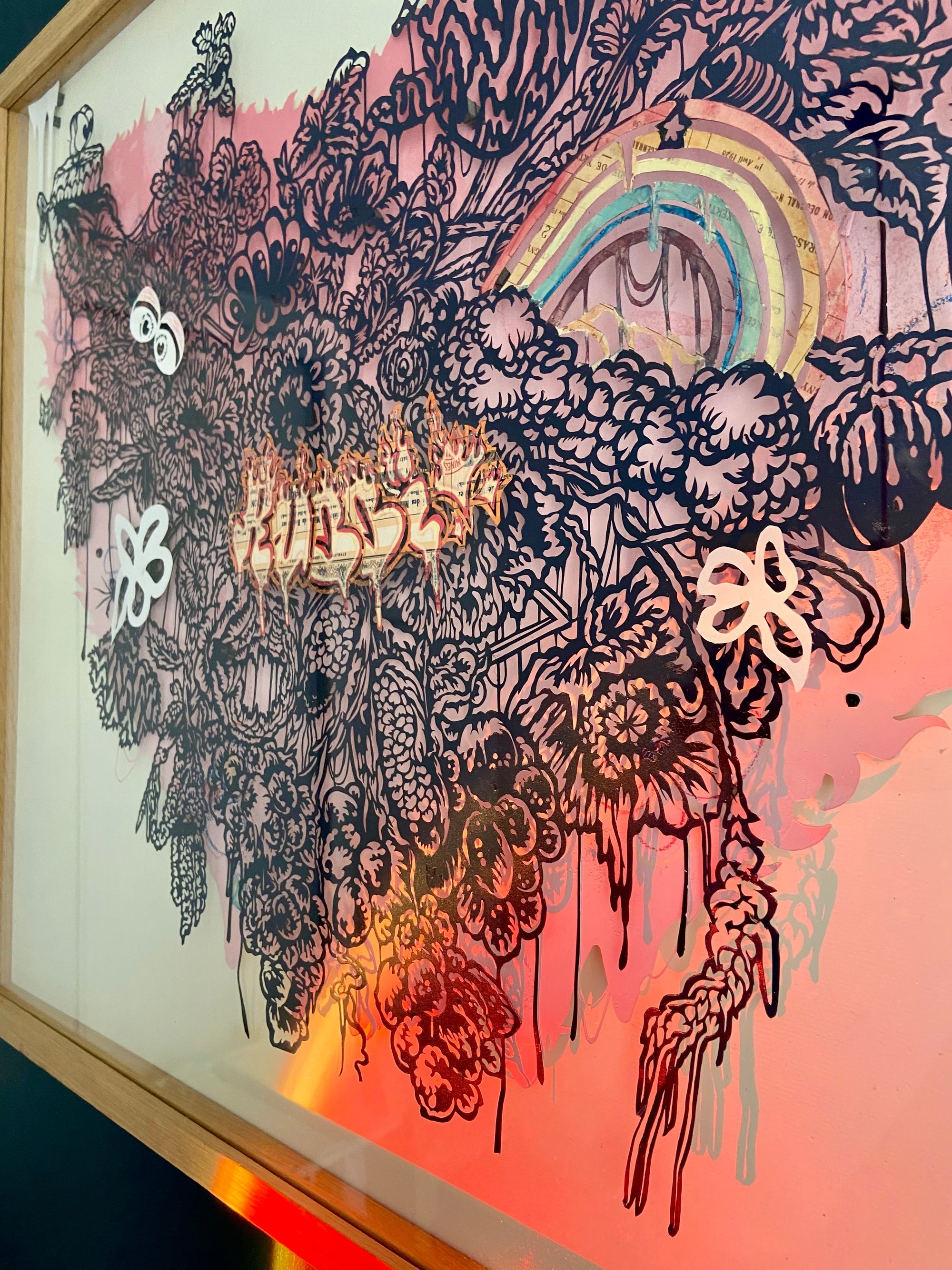 Technique: papier découpé, superposition de découpe, acrylique et craies grasses & aquarelles.